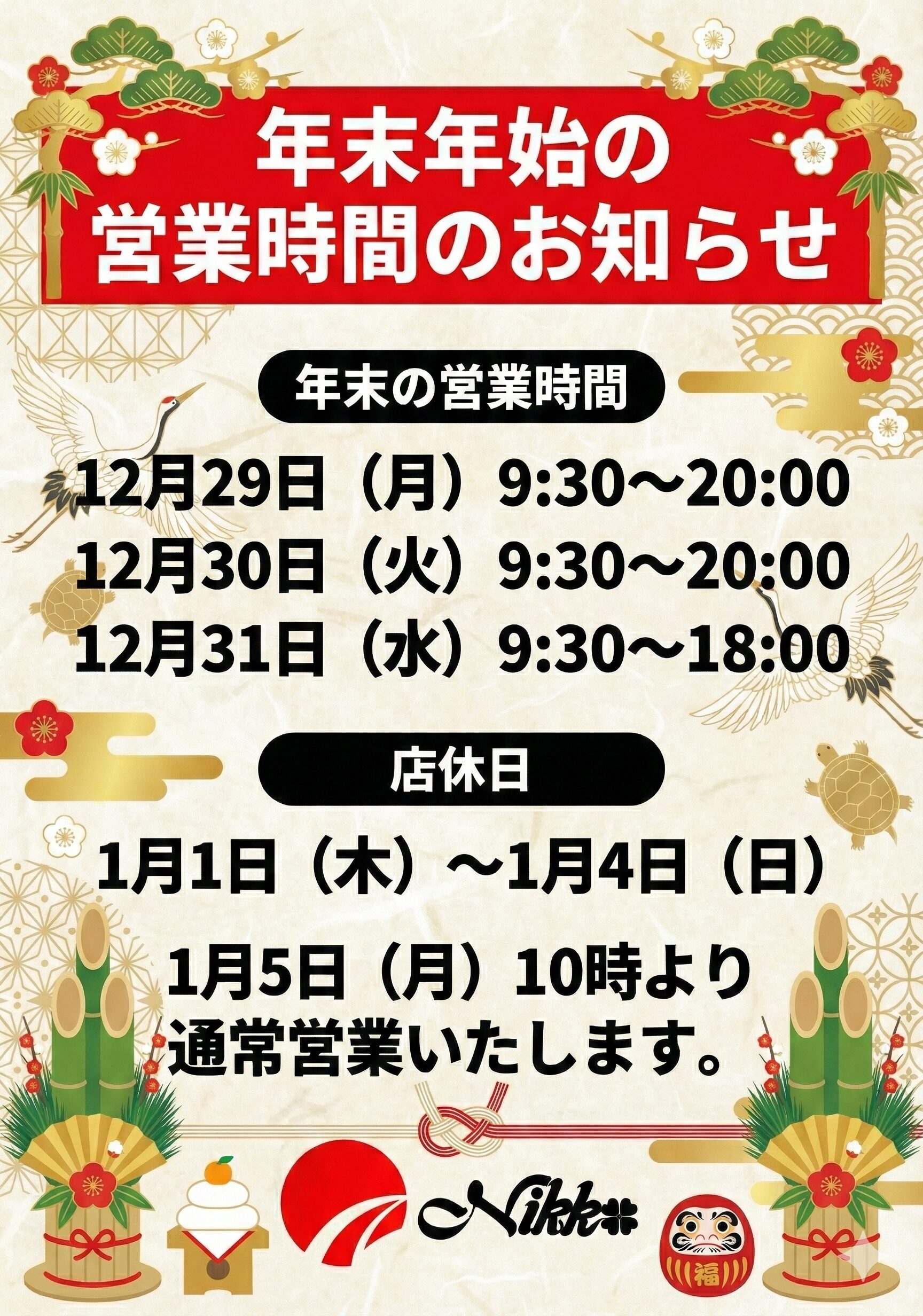 12月31日(水) 9:30 ~ 18:00 ※大晦日は18時までの短縮営業となります。